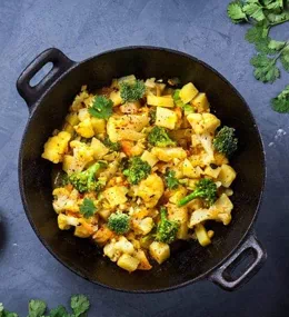 Aardappelen en bloemkoolroosjes gekookt met geroosterde Indiase kruiden